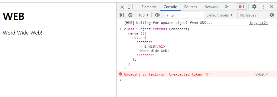 | class Subject extends Component{ render(){ return( <header> <h1>WEB</h1> Word Wide Web! </header> ); } } class App extends Component { render(){ return ( <div className="App"> <Subject></Subject> </div> ); } } |