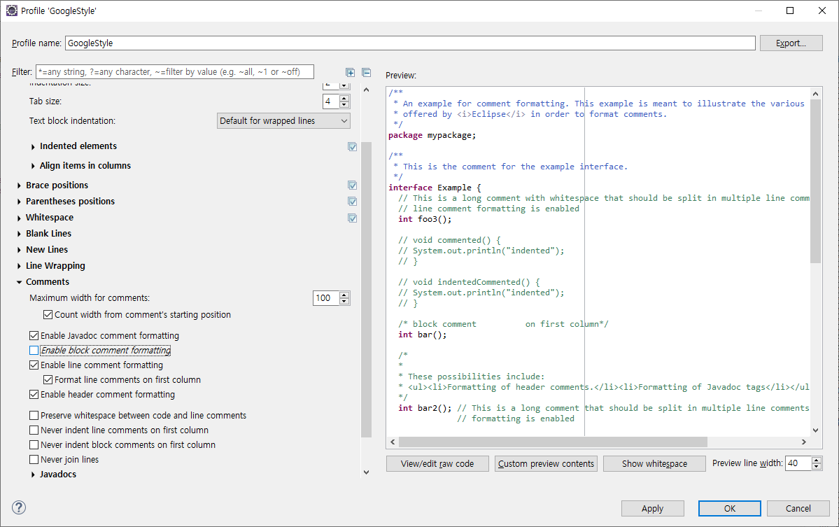 - Window - Preference - Java - Code Style - Formatter - New(새로운 프로필 생성) - Edit - Comments