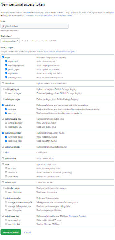 4. 토큰이름 작성, 만료일 선택(유효기간), 허용범위 선택